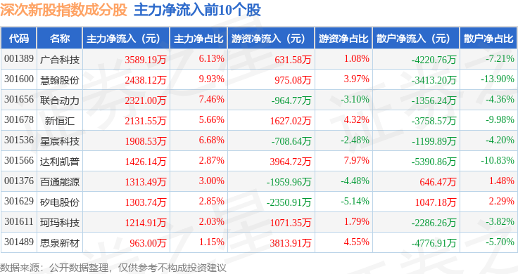 资金流向方面,深次新股(399678)指数成份股当日主力资金净流出合计4.38亿元,游资资金净流入合计5169.22万元,散户资金净流入合计3.86亿元。成份股资金流向详情见下表: