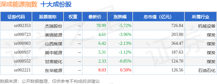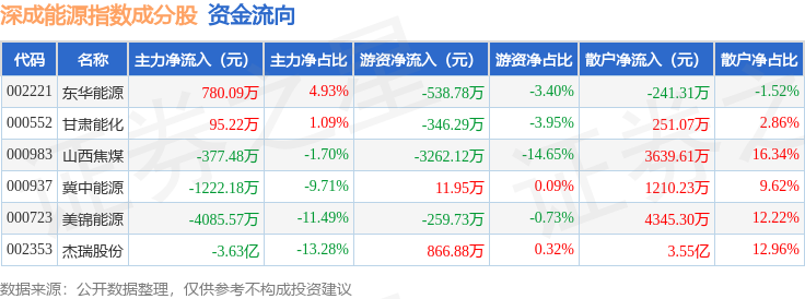 资金流向方面,深成能源(399680)指数成份股当日主力资金净流出合计4.11亿元,游资资金净流出合计3528.09万元,散户资金净流入合计4.47亿元。成份股资金流向详情见下表: