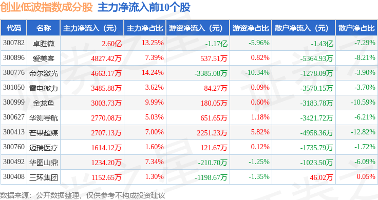 资金流向方面,创业低波(399692)指数成份股当日主力资金净流出合计22.98亿元,游资资金净流入合计101.42万元,散户资金净流入合计22.97亿元。成份股资金流向详情见下表: