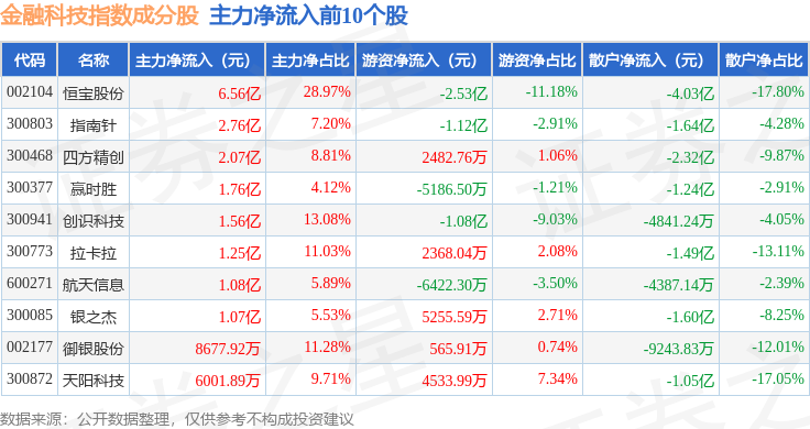 资金流向方面,金融科技(399699)指数成份股当日主力资金净流入合计5.11亿元,游资资金净流入合计1625.16万元,散户资金净流出合计4.93亿元。成份股资金流向详情见下表: