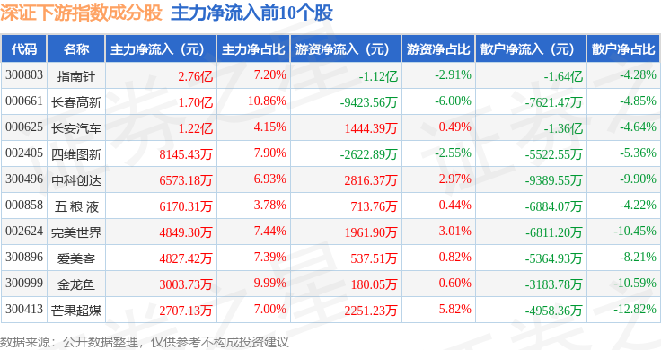 资金流向方面,深证下游(399706)指数成份股当日主力资金净流出合计25.91亿元,游资资金净流入合计2.6亿元,散户资金净流入合计23.32亿元。成份股资金流向详情见下表: