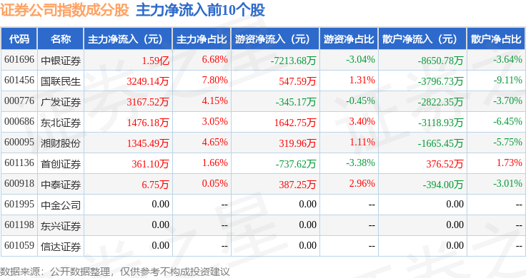 资金流向方面,证券公司(399975)指数成份股当日主力资金净流出合计12.6亿元,游资资金净流入合计4.31亿元,散户资金净流入合计8.29亿元。成份股资金流向详情见下表: