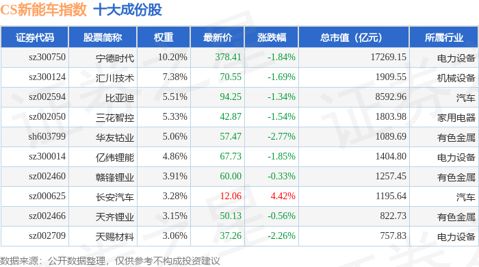 证券之星消息,12月16日,CS新能车(399976)指数报收于4096.59点,跌1.65%,成交593.66亿元,换手率2.36%。当日该指数成份股中,上涨的有4家,长安汽车以4.42%的涨幅领涨,下跌的有46家,恩捷股份以7.47%的跌幅领跌。
