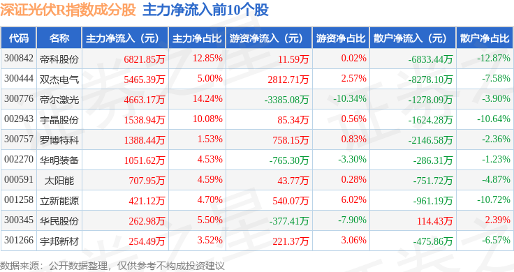 资金流向方面,深证光伏R(470035)指数成份股当日主力资金净流出合计38.25亿元,游资资金净流入合计5.31亿元,散户资金净流入合计32.95亿元。成份股资金流向详情见下表: