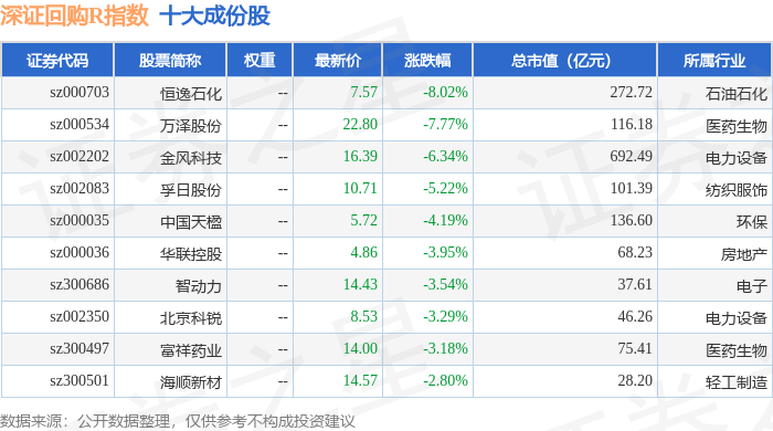 证券之星消息,12月16日,深证回购R(470063)指数报收于3119.76点,跌1.81%,成交378.27亿元,换手率1.88%。当日该指数成份股中,上涨的有8家,顺灏股份以3.82%的涨幅领涨,下跌的有41家,恒逸石化以8.02%的跌幅领跌。