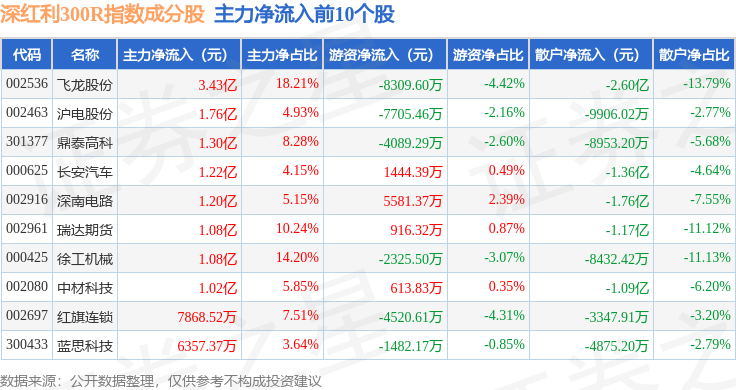 资金流向方面,深红利300R(470062)指数成份股当日主力资金净流出合计97.42亿元,游资资金净流入合计10.47亿元,散户资金净流入合计86.95亿元。成份股资金流向详情见下表: