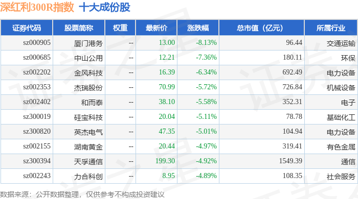 证券之星消息,12月16日,深红利300R(470062)指数报收于7955.54点,跌1.09%,成交1564.08亿元,换手率1.48%。当日该指数成份股中,上涨的有50家,红旗连锁以9.95%的涨幅领涨,下跌的有246家,厦门港务以8.13%的跌幅领跌。