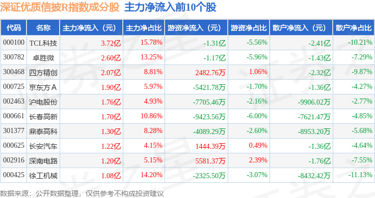 资金流向方面,深证优质信披R(470065)指数成份股当日主力资金净流出合计188.84亿元,游资资金净流入合计34.74亿元,散户资金净流入合计154.1亿元。成份股资金流向详情见下表: