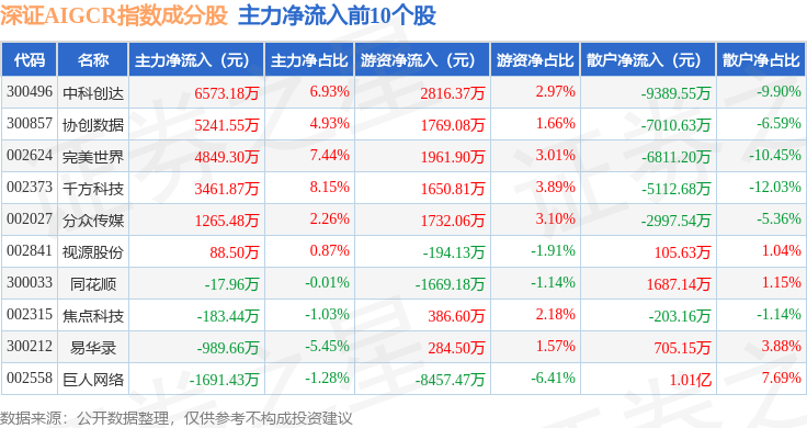 资金流向方面,深证AIGCR(470075)指数成份股当日主力资金净流出合计20.82亿元,游资资金净流入合计5.28亿元,散户资金净流入合计15.54亿元。成份股资金流向详情见下表: