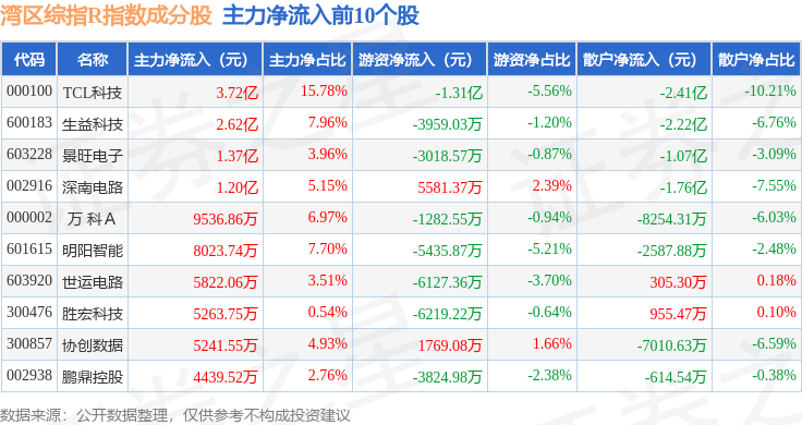 资金流向方面,湾区综指R(480003)指数成份股当日主力资金净流出合计67.49亿元,游资资金净流入合计8560.16万元,散户资金净流入合计66.52亿元。成份股资金流向详情见下表: