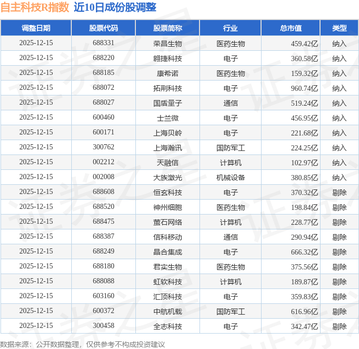 近10日内自主科技R(480033)指数成份股做了调整,新纳入了10只股票,剔除了10只股票。