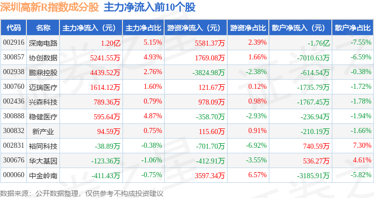 资金流向方面,深圳高新R(480038)指数成份股当日主力资金净流出合计32.36亿元,游资资金净流入合计5655.74万元,散户资金净流入合计31.8亿元。成份股资金流向详情见下表:
