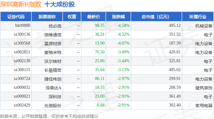 证券之星消息,12月16日,深圳高新R(480038)指数报收于5197.48点,跌1.35%,成交592.0亿元,换手率1.57%。当日该指数成份股中,上涨的有9家,英维克以3.07%的涨幅领涨,下跌的有41家,优必选以4.58%的跌幅领跌。