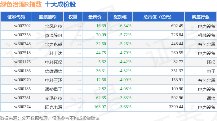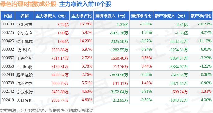 资金流向方面,绿色治理R(480058)指数成份股当日主力资金净流出合计68.31亿元,游资资金净流入合计8.7亿元,散户资金净流入合计59.6亿元。成份股资金流向详情见下表: