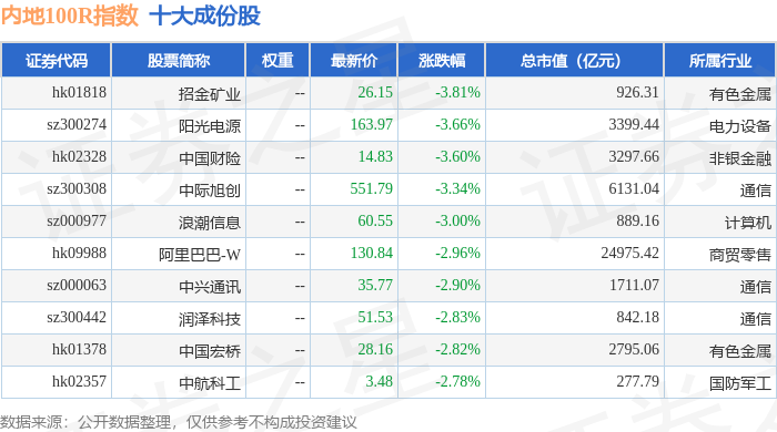内地100R(483001)指数十大成份股详情如下: