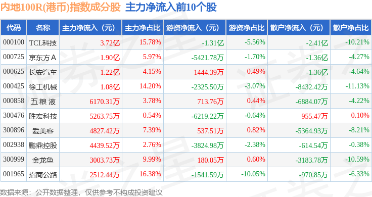 资金流向方面,内地100R(港币)(483002)指数成份股当日主力资金净流出合计65.18亿元,游资资金净流入合计23.11亿元,散户资金净流入合计42.07亿元。成份股资金流向详情见下表:
