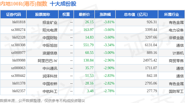 内地100R(港币)(483002)指数十大成份股详情如下: