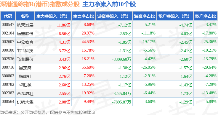 资金流向方面,深港通综指R(港币)(483006)指数成份股当日主力资金净流出合计390.6亿元,游资资金净流入合计63.89亿元,散户资金净流入合计326.71亿元。成份股资金流向详情见下表: