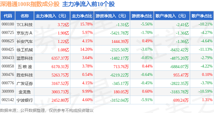 资金流向方面,深港通100R(483007)指数成份股当日主力资金净流出合计73.4亿元,游资资金净流入合计35.51亿元,散户资金净流入合计37.89亿元。成份股资金流向详情见下表: