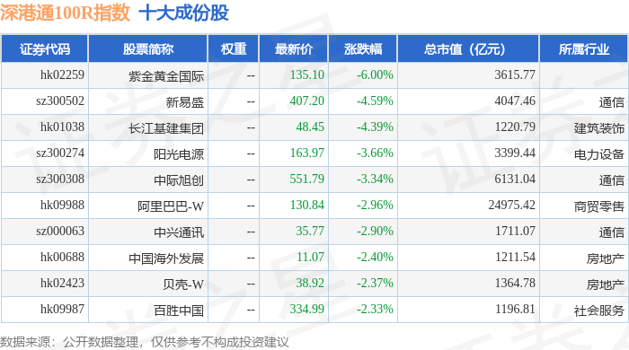 证券之星消息,12月16日,深港通100R(483007)指数报收于9006.21点,跌1.51%,成交1738.07亿元,换手率0.41%。当日该指数成份股中,上涨的有17家,长安汽车以4.42%的涨幅领涨,下跌的有81家,紫金黄金国际以6.0%的跌幅领跌。