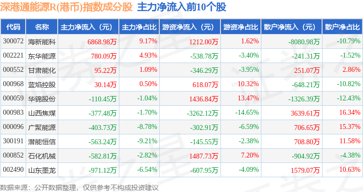 资金流向方面,深港通能源R(港币)(483014)指数成份股当日主力资金净流出合计3.69亿元,游资资金净流入合计170.13万元,散户资金净流入合计3.67亿元。成份股资金流向详情见下表: