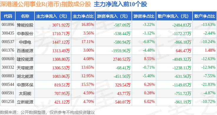 资金流向方面,深港通公用事业R(港币)(483032)指数成份股当日主力资金净流出合计3.16亿元,游资资金净流入合计4914.05万元,散户资金净流入合计2.67亿元。成份股资金流向详情见下表: