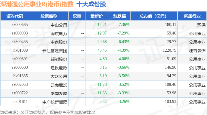 深港通公用事业R(港币)(483032)指数十大成份股详情如下: