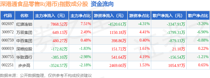 资金流向方面,深港通食品零售R(港币)(483038)指数成份股当日主力资金净流入合计4915.43万元,游资资金净流入合计191.39万元,散户资金净流出合计5106.82万元。成份股资金流向详情见下表: