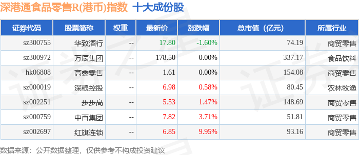 深港通食品零售R(港币)(483038)指数十大成份股详情如下: