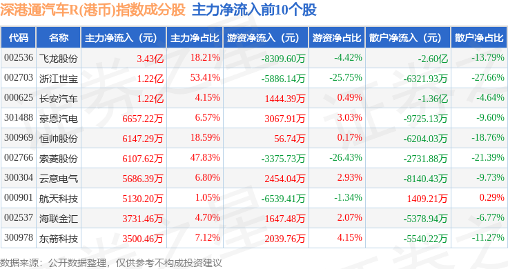 资金流向方面,深港通汽车R(港币)(483040)指数成份股当日主力资金净流出合计4.63亿元,游资资金净流出合计4474.27万元,散户资金净流入合计5.08亿元。成份股资金流向详情见下表: