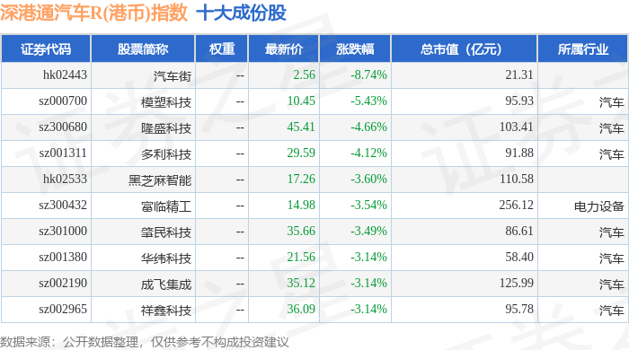 深港通汽车R(港币)(483040)指数十大成份股详情如下: