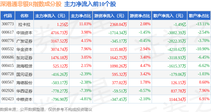 资金流向方面,深港通非银R(483053)指数成份股当日主力资金净流出合计4.67亿元,游资资金净流入合计2.98亿元,散户资金净流入合计1.69亿元。成份股资金流向详情见下表: