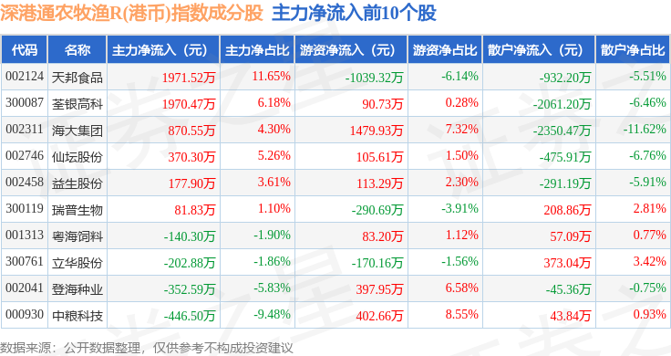 资金流向方面,深港通农牧渔R(港币)(483052)指数成份股当日主力资金净流出合计5.11亿元,游资资金净流入合计2303.8万元,散户资金净流入合计4.88亿元。成份股资金流向详情见下表: