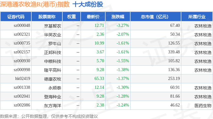 深港通农牧渔R(港币)(483052)指数十大成份股详情如下:
