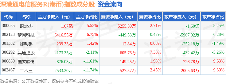 资金流向方面,深港通电信服务R(港币)(483058)指数成份股当日主力资金净流入合计1.38亿元,游资资金净流入合计6101.48万元,散户资金净流出合计1.99亿元。成份股资金流向详情见下表: