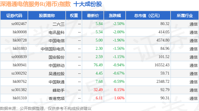 深港通电信服务R(港币)(483058)指数十大成份股详情如下: