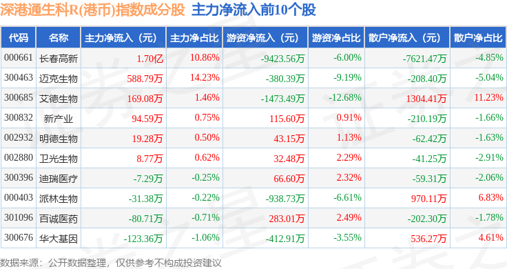 资金流向方面,深港通生科R(港币)(483060)指数成份股当日主力资金净流出合计2.74亿元,游资资金净流出合计1.57亿元,散户资金净流入合计4.31亿元。成份股资金流向详情见下表: