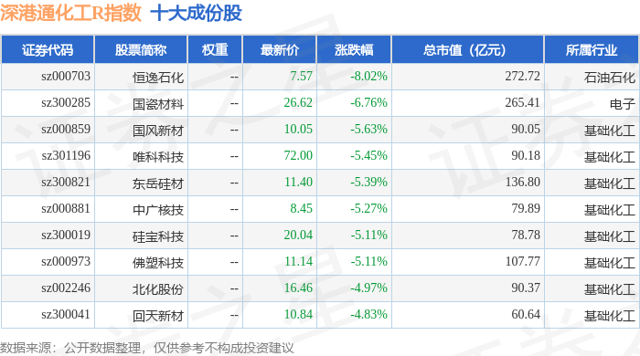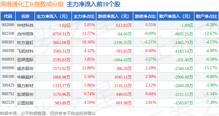资金流向方面,深港通化工R(483063)指数成份股当日主力资金净流出合计23.05亿元,游资资金净流入合计3.06亿元,散户资金净流入合计19.99亿元。成份股资金流向详情见下表: