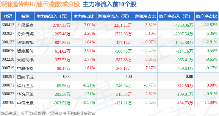 资金流向方面,深港通传媒R(港币)(483076)指数成份股当日主力资金净流出合计16.13亿元,游资资金净流入合计3.71亿元,散户资金净流入合计12.42亿元。成份股资金流向详情见下表: