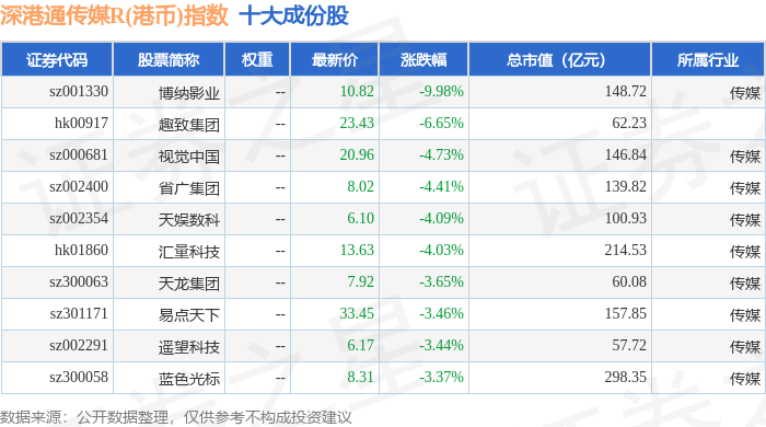 深港通传媒R(港币)(483076)指数十大成份股详情如下: