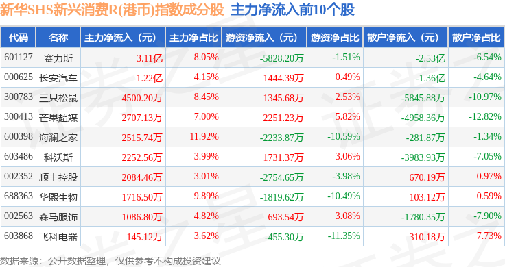 资金流向方面,新华SHS新兴消费R(港币)(489007)指数成份股当日主力资金净流出合计4.3亿元,游资资金净流入合计1.7亿元,散户资金净流入合计2.6亿元。成份股资金流向详情见下表: