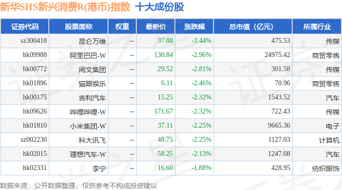 新华SHS新兴消费R(港币)(489007)指数十大成份股详情如下: