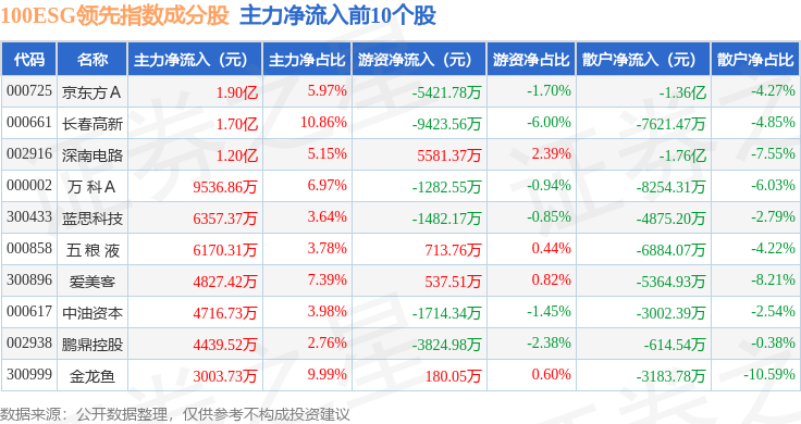 资金流向方面,100ESG领先(970030)指数成份股当日主力资金净流出合计66.21亿元,游资资金净流入合计20.79亿元,散户资金净流入合计45.42亿元。成份股资金流向详情见下表:
