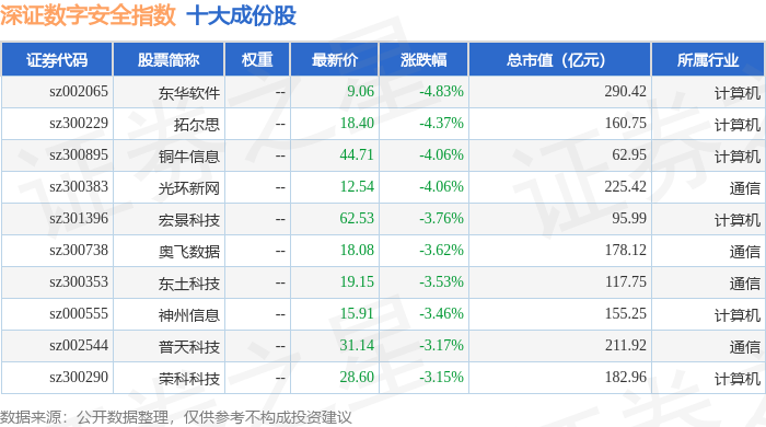 资金流向方面,深证数字安全(970052)指数成份股当日主力资金净流出合计3.26亿元,游资资金净流入合计332.07万元,散户资金净流入合计3.23亿元。成份股资金流向详情见下表: