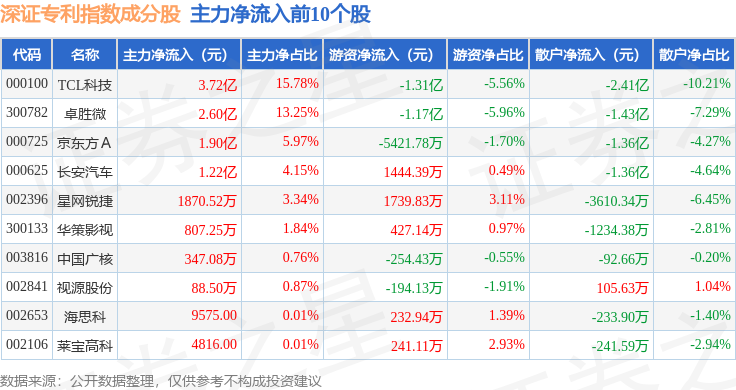 资金流向方面,深证专利(970067)指数成份股当日主力资金净流出合计35.97亿元,游资资金净流入合计4.09亿元,散户资金净流入合计31.88亿元。成份股资金流向详情见下表:
