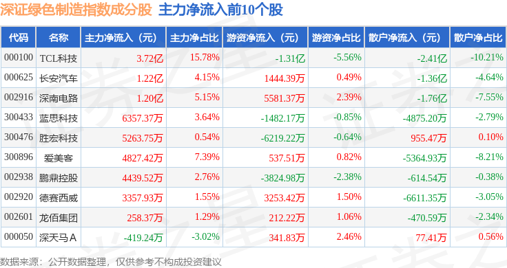 资金流向方面,深证绿色制造(970069)指数成份股当日主力资金净流出合计53.34亿元,游资资金净流入合计3485.14万元,散户资金净流入合计52.99亿元。成份股资金流向详情见下表: