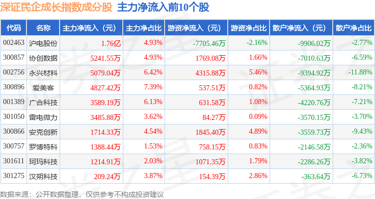 资金流向方面,深证民企成长(970071)指数成份股当日主力资金净流出合计78.55亿元,游资资金净流入合计34.01亿元,散户资金净流入合计44.55亿元。成份股资金流向详情见下表: