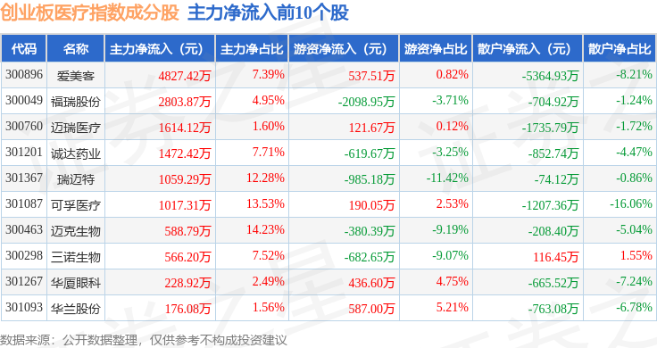 资金流向方面,创业板医疗(970082)指数成份股当日主力资金净流出合计2.61亿元,游资资金净流出合计6319.96万元,散户资金净流入合计3.25亿元。成份股资金流向详情见下表: