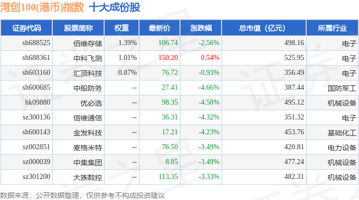 湾创100(港币)(980002)指数十大成份股详情如下: