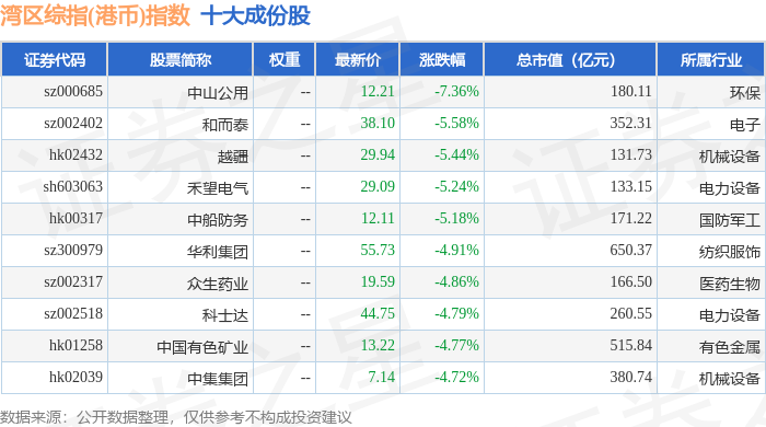 湾区综指(港币)(980004)指数十大成份股详情如下: